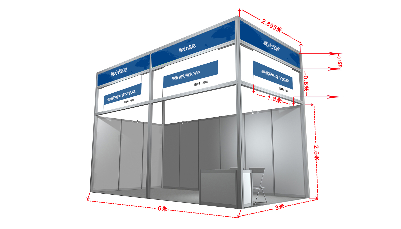 标准展位配置包含:标准展位搭建,展位正上方楣板,一张咨询桌,两把折椅,两盏射灯,一个电源插座,一个纸篓,展位里满铺地毯。